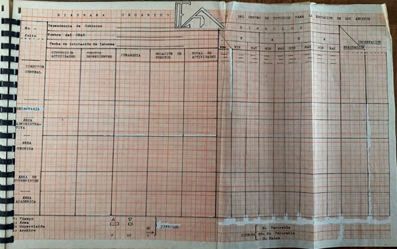 La fecha de iniciación de labores o, sea el inicio de clases en el Centro de Estudios para Adultos; {antes se pone número de folio al documento} posteriormente se le saca una copia al diagrama que se le enviará a la institución que nos subsidia. En el lado izquierdo del mismo se ponen las áreas de importancia, como el siguiente esquema: